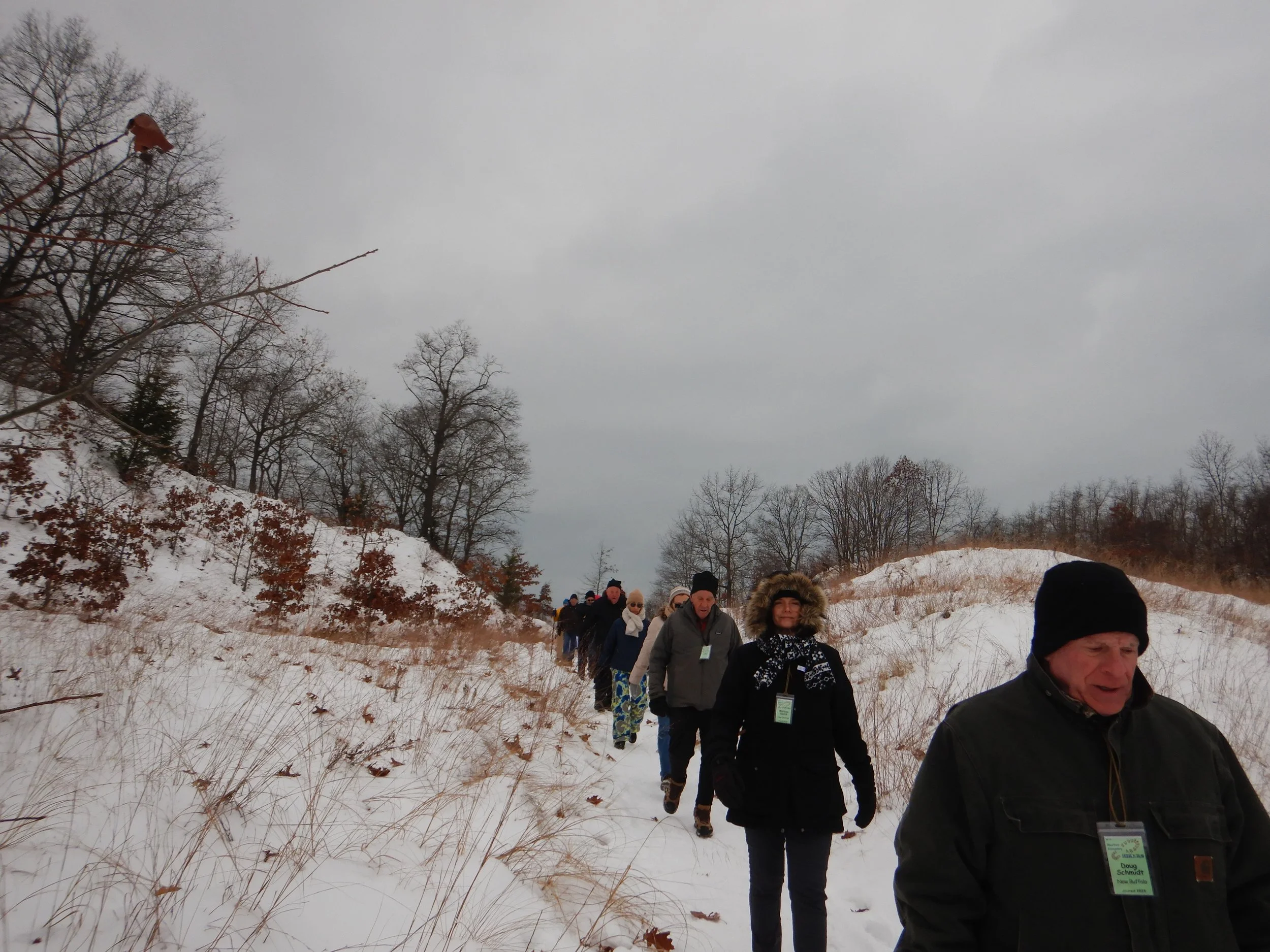 Two inches of freshly fallen snow and partly sunny skies made for a perfect afternoon hike for the 16 people (including two newcomers) who showed up at Warren Dunes. The group had virtually the whole area around Floral Road to itself–we only encountered one other hiker. Leader Pat Fisher pointed out several girdled oak trees along the way, victims of Oak wilt, a fungal infection that is spread by beetles and is almost always fatal. Killing trees with the disease keeps it from spreading to other oaks in the forest. One hiker pointed out holes in trees made by pileated woodpeckers. Others inspected birdhouses nailed to several trees and proclaimed them homes for wood ducks. (Photo by member Mark Piper.)