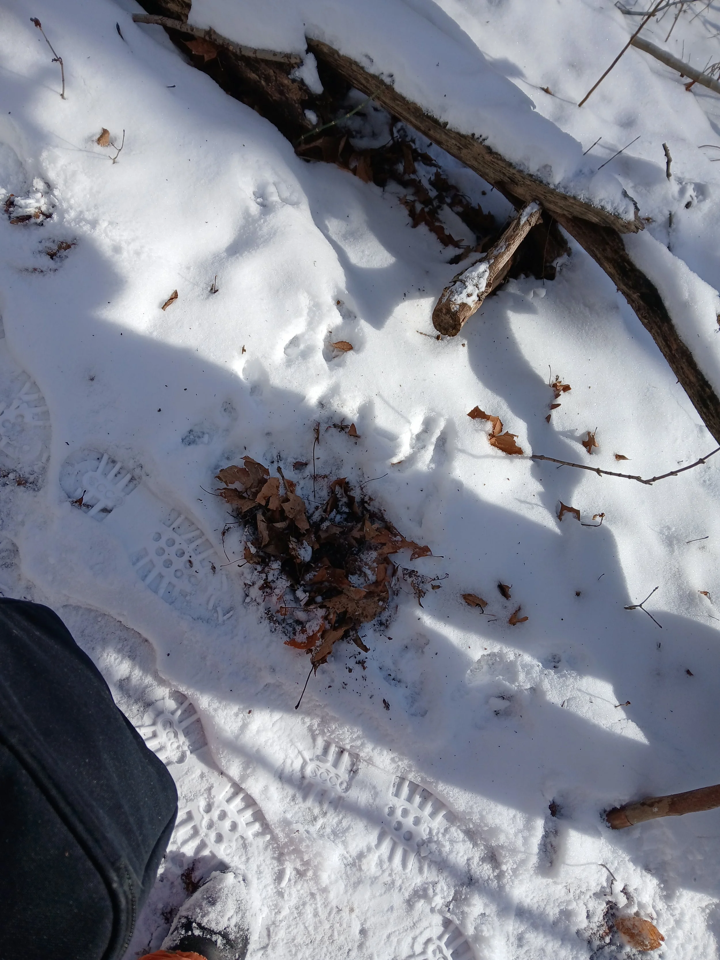 The trail near the river is a couple of years old and makes for interesting walking. We were told how important it is to allow leaves to stay on the ground throughout the winter. Leaves are insulators for trees. Tree frogs freeze under leaves, and some beneficial pollinators like native bees and butterflies leave overwintering eggs under leaves. We noted a disturbed leaf pile, called that because an animal had looked through it for food.